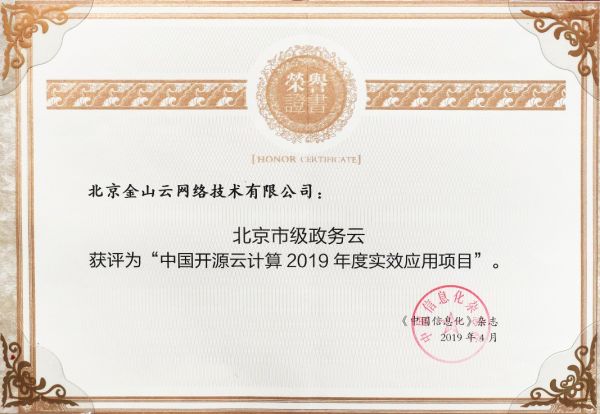金山云“北京市级政务云”获奖证书