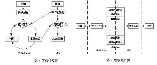 开发板上电初期,FPGA Fabric和片上CPU互相独立工作,FPGA Fabric等待U盘设备插入,随后枚举U盘的设备信息,给U盘分配具体地址,在CPU发起读U盘请求之前,保持USB总线处于空闲状态,与此同时,CPU完成OLED屏幕的初始化,当需要更新图片信息时,向FPGA Fabric发起一次传输请求,FPGA Fabric根据CPU传来的扇区地址等完成一次扇区操作,将单个扇区数据缓存到共享RAM中供CPU挂载文件系统、操作文件使用。