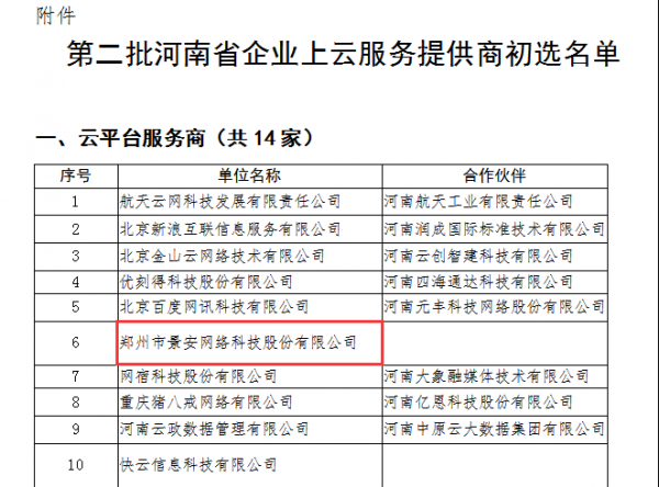 为做好河南省企业上云技术支撑和服务保障工作,加快推动企业上云,日前,由省工业和信息化厅组织申报的“企业上云”行动计划云服务商(第二批征集)名单对外公示。景安网络凭借15年来专业的数据中心、云计算服务,及优质的用户体验,成功入选省级“云平台服务商”。