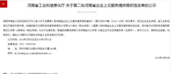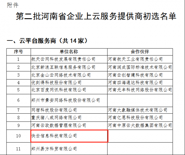 为继续深入贯彻落实《国务院关于深化“互联网+先进制造业”发展工业互联网的指导意见》,推进“中国制造2025”和“互联网+”,促进河南工业互联网发展,加深全省“企业上云”。近日,河南省工业和信息化厅组织申报的“企业上云”行动计划云服务商(第二批征集)名单对外公示。快云信息科技有限公司等14家企业成功入选省级“企业上云”云平台综合服务商。