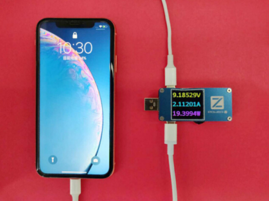 当给一部电量为34%的iPhone XR充电时,测得数据为9.18V-2.11A-19.39W,数据属于合理范围。