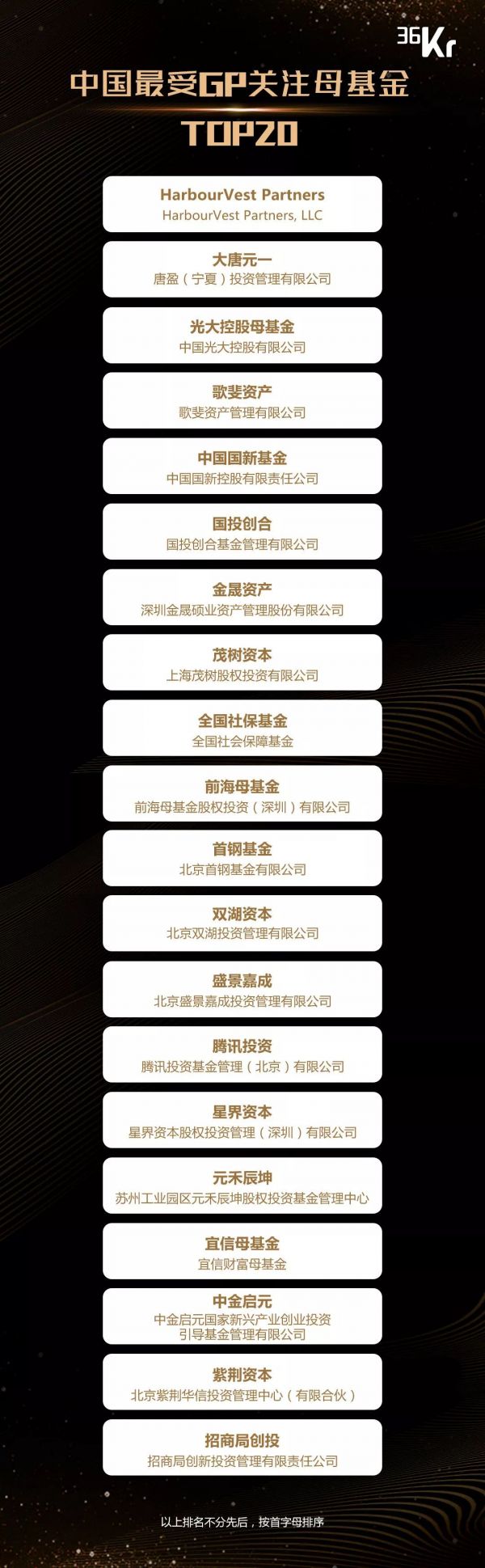 36氪通过数据调研、采访3700家投资机构和中国头部50家母基金,整理分析了3000个融资项目、近5000个融资事件,结合数据调研和母基金访谈,36氪发布中国创业投资/私募股权行业黑马奖和白马奖以及有限合伙人奖项。