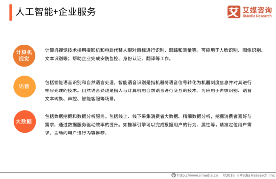 目前,中国人工智能行业已经进入产业化阶段。据iiMedia Research(艾媒咨询)发布的《2018中国人工智能产业研究报告——商业应用篇》数据显示,随着中国进一步深化改革,中国企业数量不断增加。其中,增加的企业以中小型企业为主。