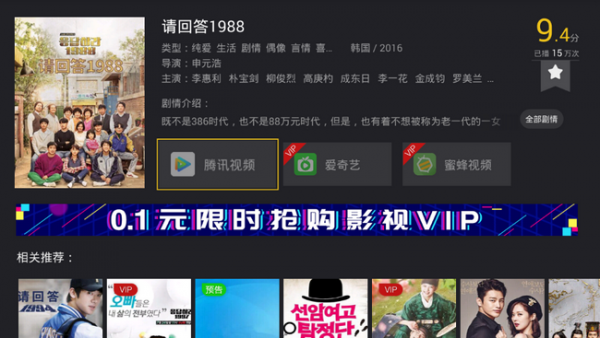 不管是精品国剧,还是韩剧热流,还是日剧,当贝影视快搜都是可以搜索到的。小编随意打开了此前热播的《请回答1988》,它会显示下载腾讯视频来收看超清正版资源,真的是非常方便。