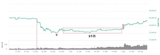 2019年1月到3月,比特币在3个月时间里徘徊在4000美元附近,一直处于焦灼状态,市场交易量也同步萎缩。