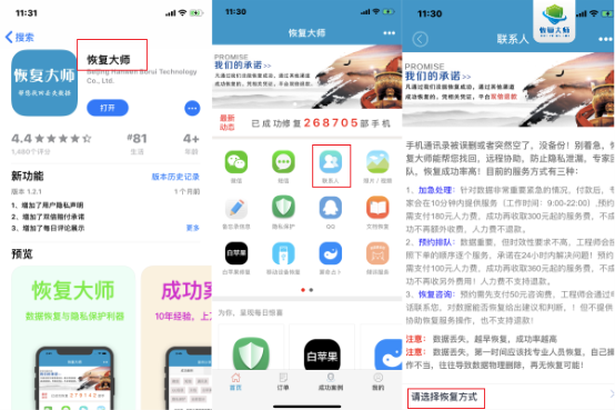 如果以上方法你都试了还是不行,最后还可以借助第三方软件试试。比如我们下载一个叫恢复大师的软件。苹果商店我们搜索恢复的时候,可以看到恢复大师是排名第一的。可见软件的可操作性也很高。我们完全可以交给专业的恢复大师,来帮助我们找回误删的联系人。