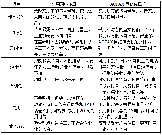 那么,用户应该怎样选择网络传真,或专属网络传真和公用网络传真的区别是什么呢?我们用一个列表来说明它们的优缺点,如下表所示: