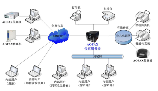 例2:AOFAX大众型A80X传真服务器是另一款针对中小企业的网络传真系统,其适用对象为10-20人以上公司;可连接1和2条传真外线,不限内部用户和漫游人数,网口连接,20G存储空间,支持无纸收发、群发、签字盖章、权限管理、免费传真等,支持客户端、网页、邮件三种收发方式。其拓扑图如下: