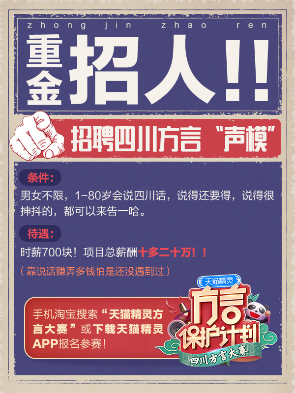 上周,阿里人工智能实验室宣布将于6月13日,举行“四川方言大赛”,对此前招聘中选出的5名选手进行总决选,获胜者将为天猫精灵提供四川方言的语音录制,并获得700元一小时、总金额高达十多万元的报酬。