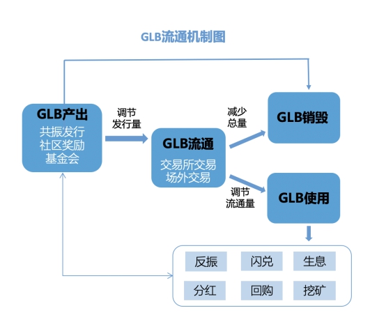 为防止GLB上线交易之后存在暴跌风险,保证GLB平稳上涨。GLB平台设置个多个开关阀门来调节GLB的总量和市场流通量,包括销毁、反振、闪兑、生息、分红、回购等调控措施。从GLB的流通机制意图可以看出,GLB平台会不定期销毁GLB,GLB Token总量会不断减少。反振、生息、回购等措施将保证GLB的市场流通量不断减少。