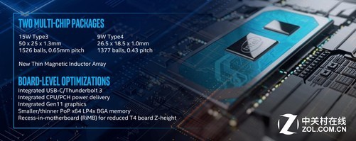 首先来看处理器封装规格。英特尔10代酷睿针对9W和15W功耗处理器进行了不同规格的封装,9W处理器芯片规格为26.5×18.5×1.0mm,针脚间距0.43mm;15W芯片规格为50×25×1.3mm,针脚间距0.65mm。二者均采用BGA封装,插槽规格分别为1526和1377。