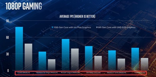 英特尔在发布10nm IceLake处理器与GEN 11核显的同时,特意强调了1080P电竞游戏的流畅运行。通过下面图标可见,搭载Intel Iris Plus核显的10代酷睿处理器能够在相应的画质模式下,较为流畅的运行一些常见的电竞游戏,如CS:GO、彩虹六号、坦克世界、堡垒之夜等,相对于现阶段8代酷睿的UHD 620核显来说,图形性能提升还是比较大的。