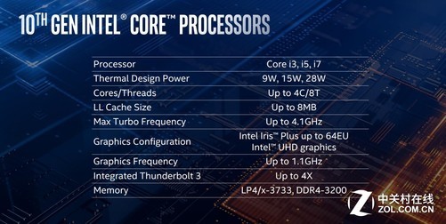 英特尔10代酷睿首批产品拥有酷睿i3、酷睿i5以及酷睿i7三个型号,没有酷睿i9。TDP主要为9W、15W、28W,采用4核8线程,缓存为8MB,最高频率4.1GHz。
