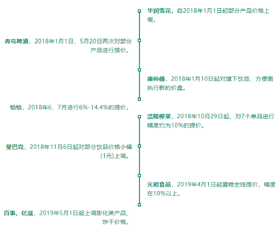 青岛啤酒,2018年1月1日、5月20日两次对部分产品进行提价。恰恰,2018年6、7月进行6%-14.4%的提价。华润雪花,自2018年1月1日起部分产品价格上调。康师傅,2018年1月10日起对旗下饮品、方便面执行新的价盘。星巴克,2018年11月6日起对部分饮品价格小幅(1元)上调。百事、亿滋,2019年5月1日起上调膨化类产品、饼干价格。涪陵榨菜,2018年10月29日起,对7个单品进行幅度约为10%的提价。元祖食品,2019年4月1日起蛋糕全线提价,幅度在10%以上。从捞小宝做的罗列可以看出,自2018年以来,很多我们耳熟能详的快消品牌都进行了调价。面对这一片并不喜人的“涨势”,我们不仅疑惑:难道通货膨胀真的来了吗?不管是水果涨价、还是快消品牌的大面积提价,都表明了人民币购买力的确出现下降趋势,也预示着通货膨胀的起头。