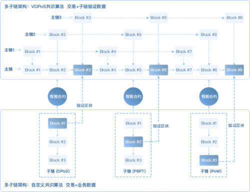 子链是附属于主链之上的子区块链网络,每条子链都有自己的共识算法,子链可以采用BFT类联盟链的共识机制,也可以采用PoW、PoS、DPoS等公链共识机制,根据不同的DApp对数据上链的效率、安全性等不同的需求而采用不同的共识算法,公链不对子链的共识机制作限制。子链在产生一定数量的区块以后,会将该部分区块对应的默克尔树的树根保存到主链的区块上,以保证子链的安全性,对应的子链上的区块称为验证区块。验证区块的保存高度间隔会根据主链的资源利用情况来自动调整,当主链的资源利用率低的时候,可能每个区块的哈希值都保存到主链上,但是当主链的资源利用率高的时候验证区块的高度间隔会比较大。