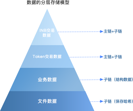 INB公链将对前述的数据进行分层存储,以满足各种数据的需求。主链上将保存INB和Token的交易数据,满足交易数据对高可信和不可篡改的需求;业务数据保存于子链之上,满足对高可用的需求。对于一些低价值或者过大的业务数据上链需求,INB公链建议将数据的哈希值保存到链上,原始数据在链下保存。