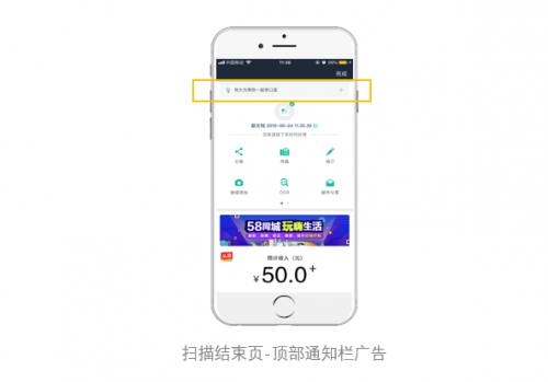 该广告位置位于扫描全能王App扫描结束页顶部通知栏。
