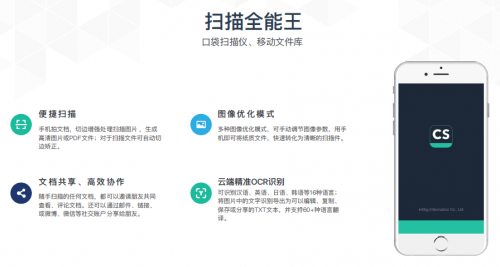CS扫描全能王是上海合合信息科技公司旗下的一款产品,目前全球用户量已经突破3.7亿,国内用户占比55%,日活跃用户500万以上,月活跃用户4000万以上,连续多年蝉联年度佳应用。