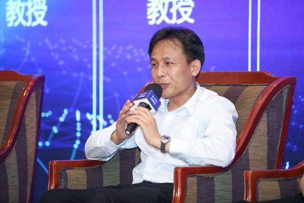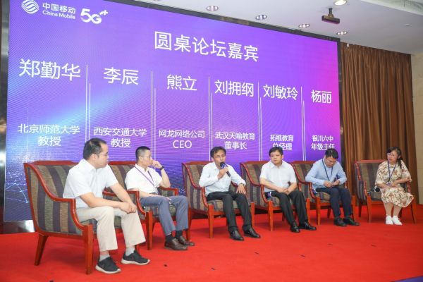 图为:网龙网络公司首席执行官熊立博士(左三)在“5G赋能教育•智慧点亮未来”教育分论坛圆桌环节发言