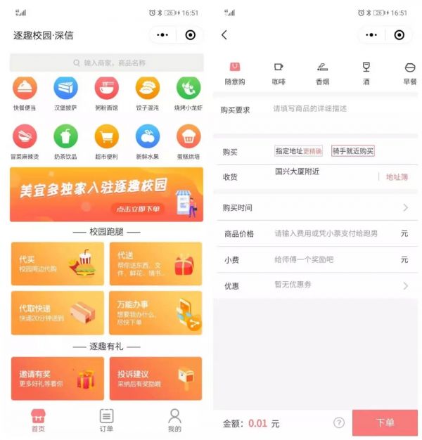 1)提供一套免费的(不收任何系统费、订单费等)、成熟的、基于乐外卖的,带有外卖、跑腿、话题圈子、商圈、教务系统等多种功能的系统平台,包括逐趣校园微信公众号、逐趣校园微信小程序、逐趣校园外卖App,有乐外卖技术团队的支持,你不用担心任何技术上的问题,一心做好市场业务即可。