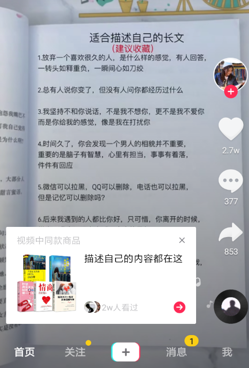 我们来看一个抖音书单号短视频的案例,上面这套书是属于情商类别的书籍,背景采用图书模板,然后配上一段能引起共鸣的文字,制作成一段短视频,抖音书单号短视频就制作完成了。上面这种玩法是最简单的单图玩法,对于抖音书单号变现有兴趣的朋友,可以网上搜兴哥分享,我这边会把抖音书单变现的详细步骤发给你。