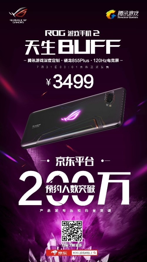 2019年7月23日,ROG玩家国度在北京凯迪拉克M空间召开了“天生BUFF” ROG 2019新品发布会,ROG游戏手机2(腾讯游戏深度定制)以3499元的价格一经亮相,便引起了业界和媒体的高度关注和好评,更成为了信仰玩家心中最期待的游戏手机。发布会上,ROG携手腾讯游戏&京东达成战略合作,京东商城成为独家销售渠道。