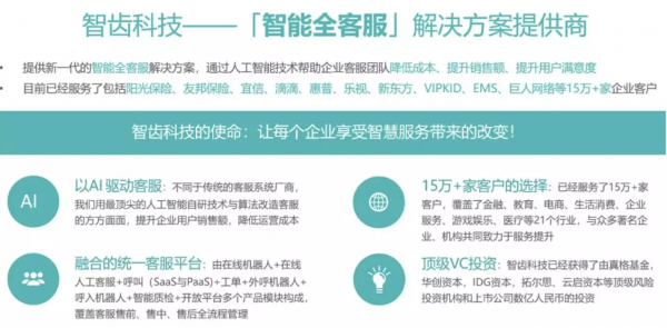 截至目前,,智齿科技产品线已经覆盖售前营销、售中干预、售后服务三大智能支撑板块,构建了完整的业务场景闭环,成为业内产品线最完整的智能全客服解决方案提供商。智齿客服的注册企业用户已超过15万,其中付费客户6000家,覆盖电商、生活消费、教育、金融、医疗、企业服务、运营商、公共服务等21个行业。