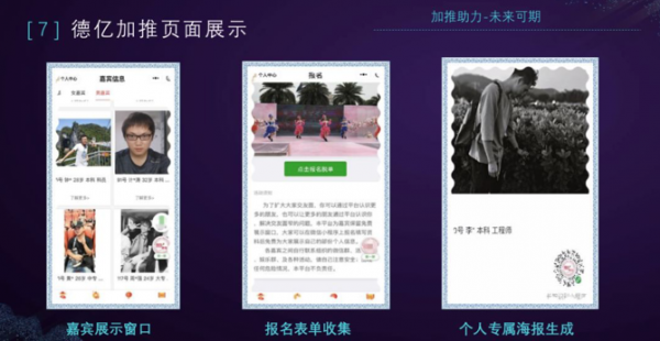 第二,正式相亲之前事先了解下彼此的信息,更有助于当天现场的沟通。如何展示那么多报名嘉宾的信息呢?德亿传媒把加推的商城功能当做嘉宾展示,每一位嘉宾的信息在展示区写得明明白白,而且一人一码支持一键转发。嘉宾及亲朋好友或者看上的对方都会转发分享了解,众多的流量就都涌进来了,活动也受到了越来越多人的关注。