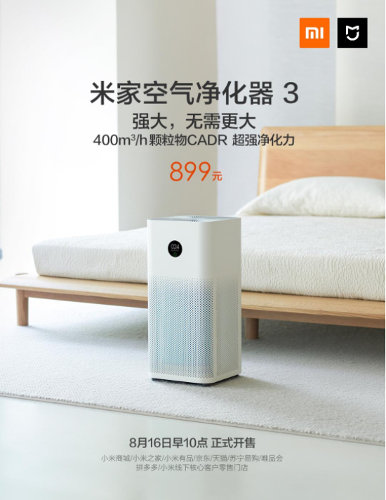 米家空气净化器3将于8月16日早上10点在小米线上线下全渠道开售,届时用户可以前往小米商城、小米之家等渠道进行选购和体验。