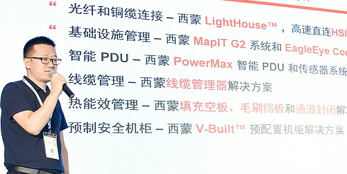 美国西蒙公司技术专家孙心明在会上发表了专题演讲,重点介绍了西蒙WheelHouse高级数据中心解决方案——该方案在西蒙现有的线缆、连接系统、机柜、线缆管理及配电系统的基础上整合了一系列全新产品创新,从而提供最全面的高级数据中心解决方案,可支持从中小型企业级到大型高性能云计算及主机托管的各种大小和类型的数据中心。WheelHouse将西蒙专为支持高密度和高带宽需求、提升部署速度、提高可扩展性、改良管理性能和效率而设计的创新型增值数据中心解决方案,与西蒙全方位的数据中心设计服务和行业领先的客户支持服务相结合,可帮助客户大幅度优化数据中心,同时还能显著降低总体成本。