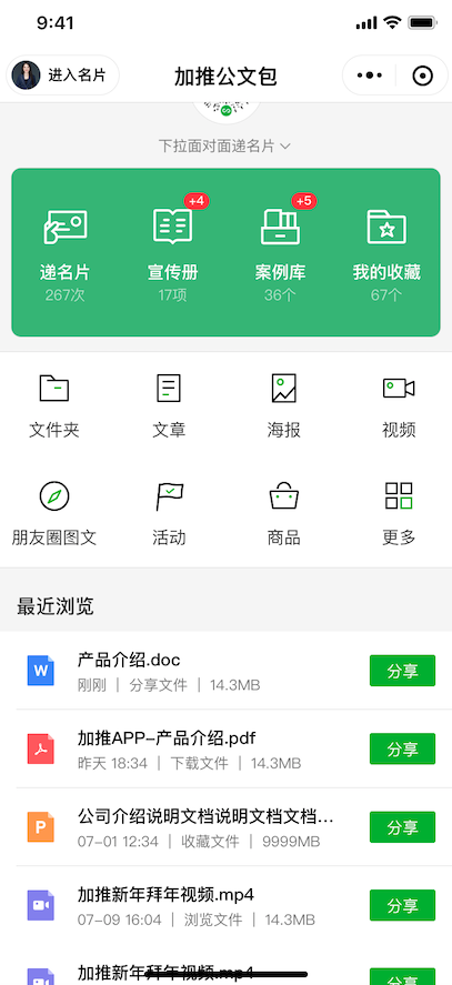 8月18日,创办两周年之际,加推新上线功能“智能公文包”,将名片、案例库、宣传册、文章等内容集成化、电子化。