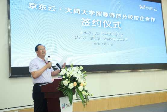 大同经开区党工委委员、管委会副主任李云平,大同市教育局副局长孙朝,大同大学浑源师范校长王聪生出席签约仪式并致辞。当天,京东产教融合学院-电商人才培养基地也正式挂牌落地。