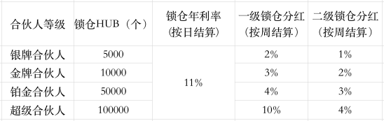 银牌及以上等级的合伙人,享有HUB锁仓利息年化收益率高达11%,按日结算,可自由交易或提币。