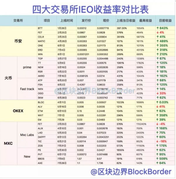 上图是采自区块边界的一张各大交易所IEO币种收益率对比图。IEO币种的收益率一定程度上体现了交易所筛选优质项目的能力。虽然不能完全说明项目的最终目标是优质的,但反过来思考,如果一个项目打从一开始就决定“收割”,这种伤害社区的做法一定会导致臭名昭著。区块链项目的社区共识本就是项目成功的关键要素之一,因此可观的收益率也能够给项目带去正面的宣传效应。