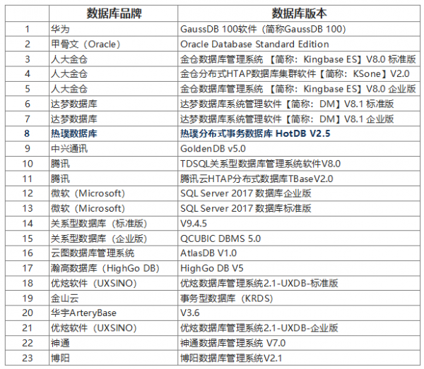在这次数据库类品目中标名单里,热璞数据库公司的分布式事务数据库HotDB V2.5,入围事务型数据库央采名单。