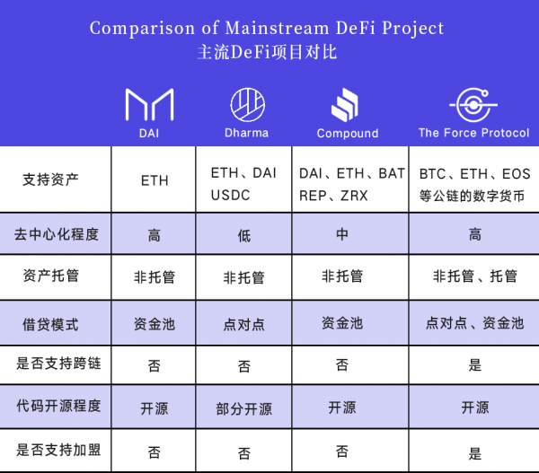 原力协议(The Force Protocol)项目于2018年年初启动,是为分布式金融(DiFi)服务应用搭建的区块链开放金融平台,原力协议是DeFi生态体系中重要的应用之一。与目前大热的DeFi项目DAI、Dharma、Compound项目相比,原力协议在支持资产、去中心化程度、借贷模式等方面均有优势。