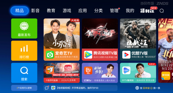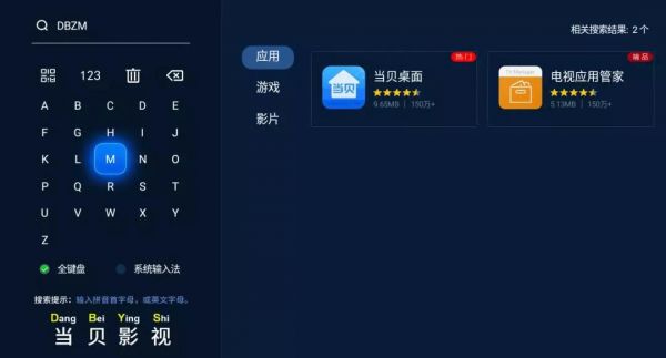 第一步:智能电视或者电视盒子打开当贝市场,直接在当贝市场中搜索“DBZM”,也就是当贝桌面的首字母拼音;