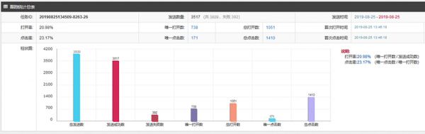 客户通过U-Mail邮件跟踪统计汇报看到,这次邮件群发活动成功发送3517封(建立群发数3809封,发送成功率92.33%),打开率20.98%,邮件点击率(收到邮件产生互动)高达23.17%。