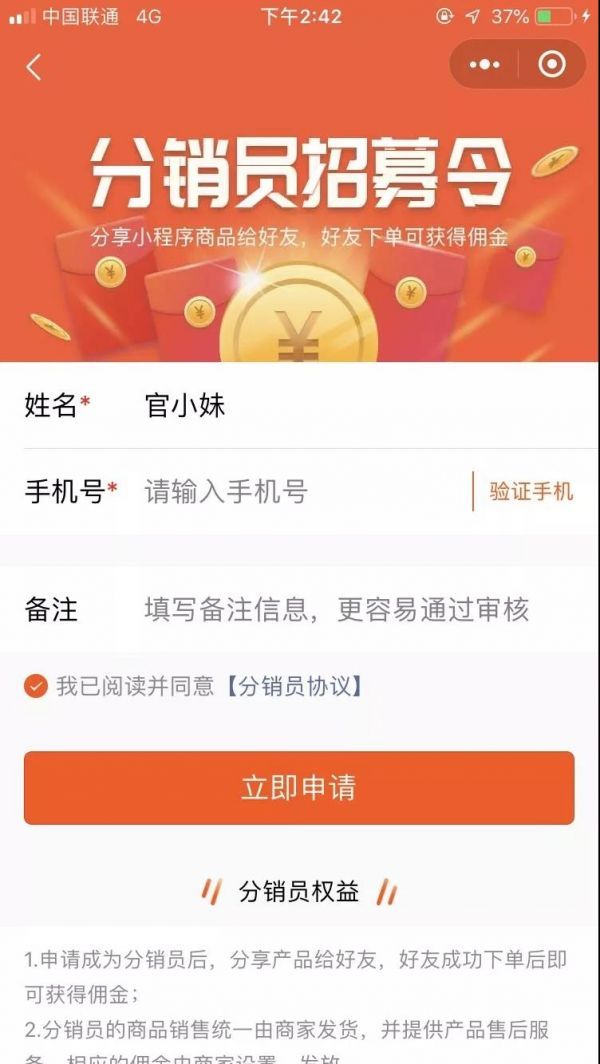 商家设置好推广规则之后,用户点击按钮即可进入申请界面成为店铺推广人员,申请成功后用户可以将相关商品转发吸引其他用户购买,以换取提成收益,简化化妆品店管理,提高销量。