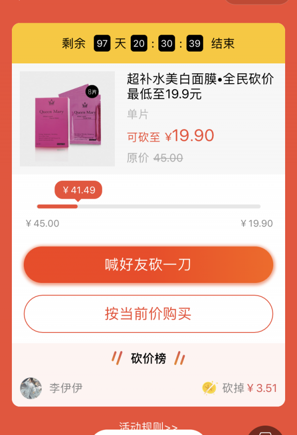 设立砍价、拼团等限时限量的主题活动,并在商品详情页等多个页面引导用户分享,是小程序中最有效的一种”以老带新“ 获取新用户方式,快速实现裂变拉新,大幅提升产品曝光量微信庞大的用户群和强社交关系链,刺激消费者转发裂变,并与商家形成高频率互动,提高裂变转化。