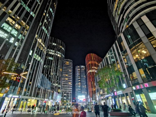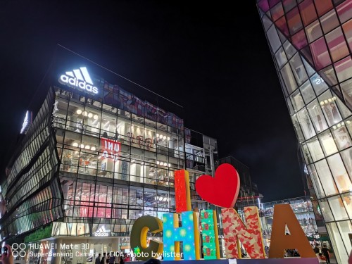 在夜景模式下,手机会自动进行4秒的长曝光,然后利用软件多帧合成技术进行降噪合成处理,令人称奇的是即使有路人来回走动和轻微的手抖,拍出的夜景照片依旧是相当清晰。特别是在光比较大灯火通明的商业区,华为Mate30的照片成片率非常的高,天空黑的非常彻底,而远处的LED广告牌虽然很亮但是却能看清内容,两侧高楼上的灯光细节也都尽收眼底,绝对是一副实力之作。