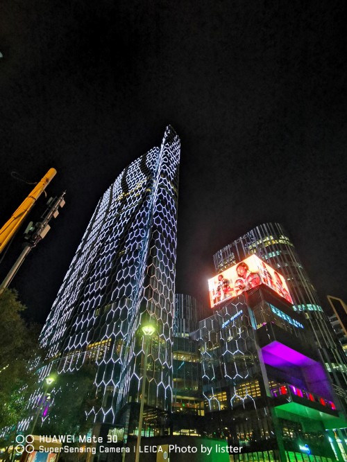 即使上图这种人眼因广告牌刺眼而无法直视的极端情况,华为Mate30开启夜景拍摄模式后,无论暗处的彩光还是广告LED屏幕的内容都精确呈现,让细节尽收眼底。