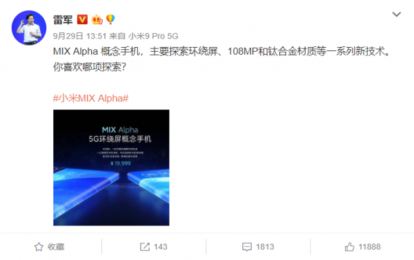 MIX Alpha不管有用没有实际使用价值,在某些方面小米确实实现了人无我有,比如它是一整块屏幕环绕,搭载了1.08亿像素主摄,呈现无孔化特点等。9月29日,雷军在微博也表示,这款概念手机主要探索环绕屏、108MP和钛合金材质等一系列技术。