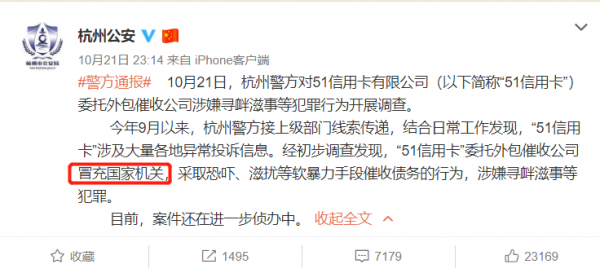 10月21日,51信用卡被查,互联网金融江湖震动,经杭州公安调查发现,51信用卡委托的外包催收公司通过冒充国家机关、采取恐吓、滋扰等软暴力手段催收债务的行为,涉嫌寻衅滋事等犯罪。