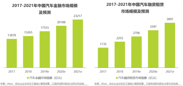 艾瑞咨询发布的2019《中国汽车融资租赁行业研究报告》显示,2018年我国汽车融资租赁的市场规模约为2255亿元,预计未来三年的复合增速为20%左右;预计到2021年,汽车金融市场规模将达23217亿元,汽车融资租赁市场规模将达3897亿元。