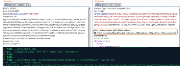 该Laravel REC漏洞的利用是需要条件的,必须满足APP_KEY泄露的情况下才能成功的利用与触发,我们SINE安全技术在整体的漏洞测试与复现过程里,共发现2个地方可以导致网站漏洞的发生,第一个是Post数据包里的cookies字段,再一个是HTTP header字段可以插入恶意的共计代码到网站后端中去.