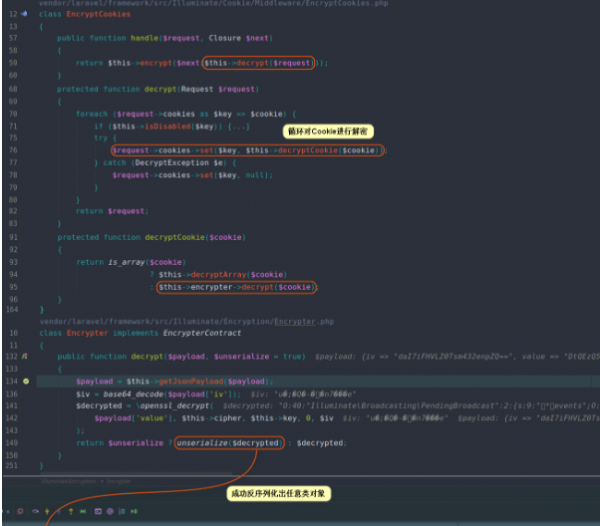 这里看这个X-XSRF-TOKEN:值,Laravel 框架在提交过程中会去判断并效验这个值,如果解密成功就会进行反序列化的操作,这里就不再一一的介绍与解释了.