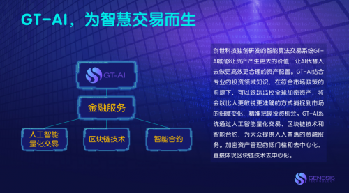 创世科技Genesis Technology(简称GT),全球智能投资管理领域崛起企业之一,独创研发的智能算法交易系统GT-AI和GTW数字货币钱包,扩大了金融服务的覆盖面,让Al代替人去做更高效更合理的资产配置,为金融行业带来了丰富的应用渠道,也带来了全新的发展模式,从而促进了金融业的变革升级。