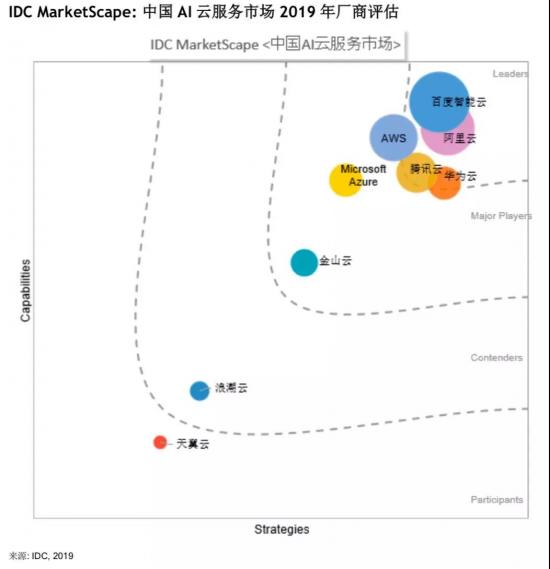 报告一称,百度智能云凭借着在AI技术、市场和商业上的优异表现,在能力和战略两个维度都处于领先地位,位居领导者象限最上方,在中国排名第一名,在其后有阿里云、AWS、腾讯云和华为云等云厂商。