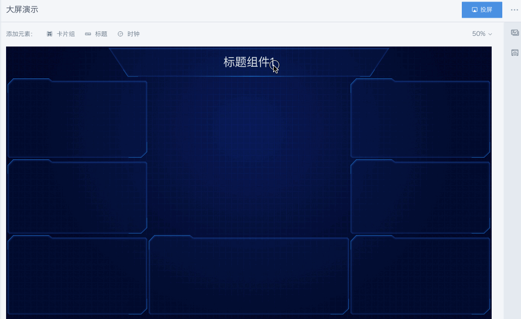 先确定大致的大屏数据内容布局,拖好卡片组和标题组的位置。推荐的大屏卡片布局,一般主要信息居中显示,次要信息在周边陈列。